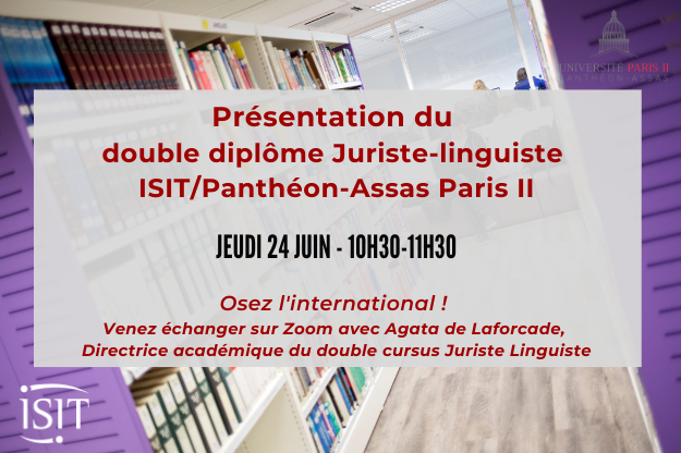 L'ISIT, grande école de Management et de communication interculturels, présentera le double diplôme Juriste linguiste établi en partenariat avec Paris 2 Panthéon-Assas.